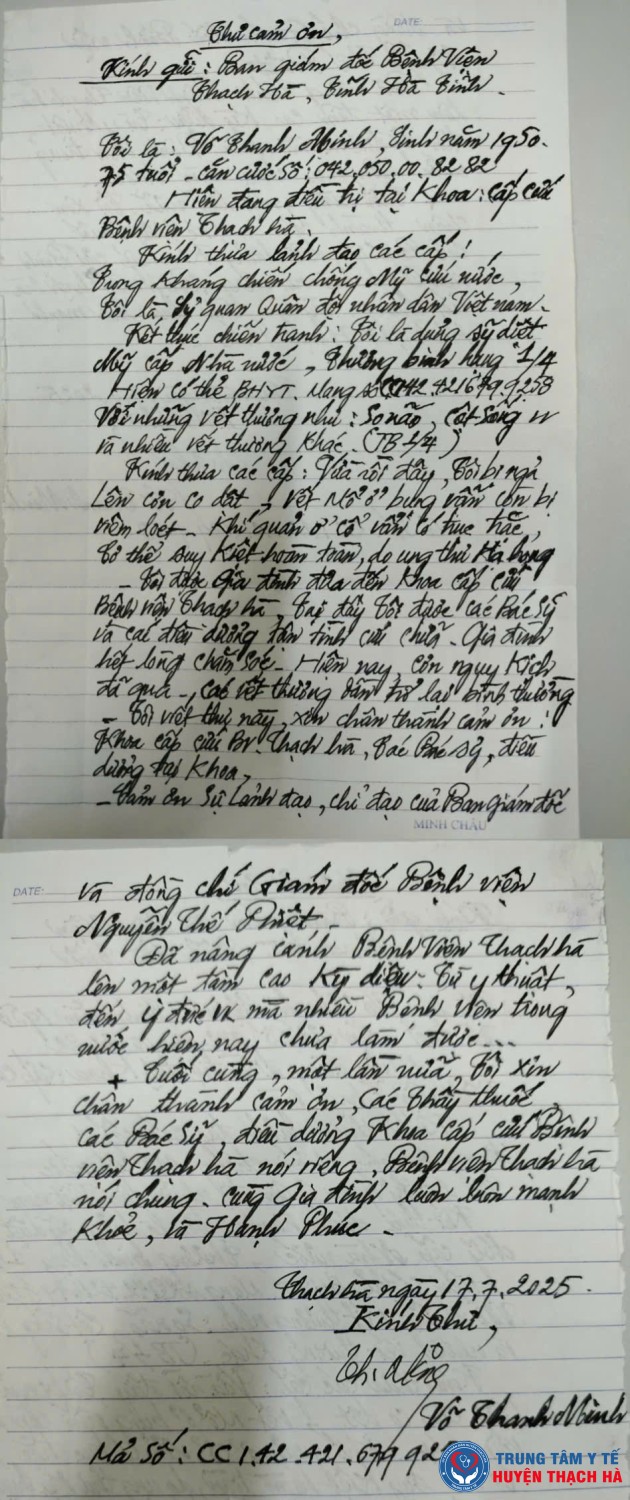 Ngày 17/7/2025, Trung tâm Y tế Thạch Hà vinh dự đón nhận bức thư cảm ơn xúc động từ bác Võ Thanh Minh, sinh năm 1950, thương binh hạng 1/4, từng tham gia chiến đấu trong cuộc kháng chiến chống Mỹ cứu nước. Hiện bác đang điều trị nội trú tại Khoa Cấp cứu của Trung tâm.