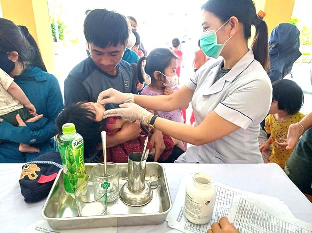 Cán bộ y tế xã Đông Kinh đang cho trẻ uống Vitamin A