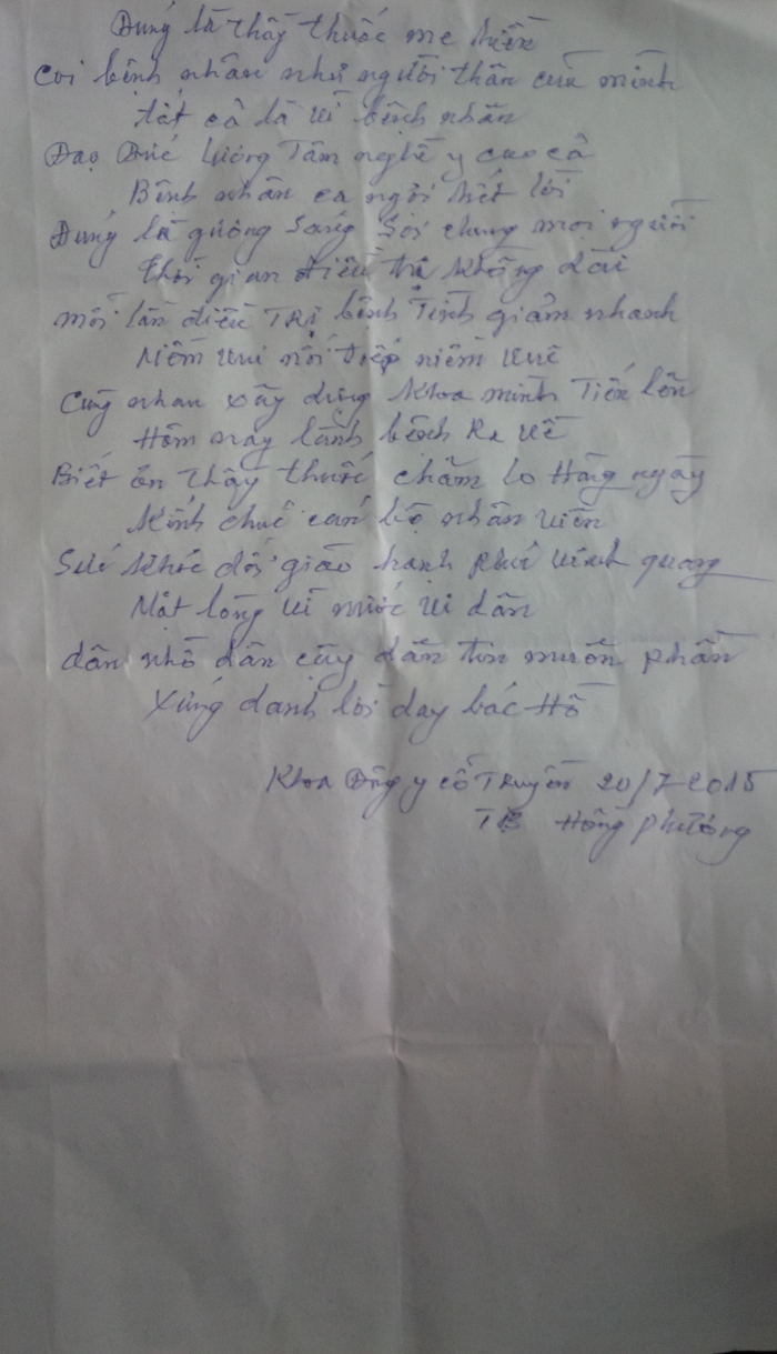 Bệnh nhân Hồng Phương sau khi điều trị khỏi bệnh tại khoa Đông Y, trước khi ra về đã làm tặng khoa bài thơ "Cảm xúc bệnh nhân" bày tỏ tấm lòng của mình đối với cán bộ tại khoa và bệnh viện.