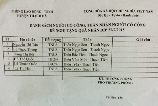 Thực hiện Chương trình công tác Hội và phong trào thanh niên năm 2015, chào mừng kỷ niệm 68 năm ngày thương binh, liệt sỹ (27/7/1947-27/7/2015); thiết thực tổ chức các hoạt động tình nguyện vì cuộc sống cộng đồng, Chi đoàn thanh niên Bệnh viện Thạch Hà đã tổ chức đi tặng quà một số gia đình, người có công tại thôn Ngọc Sơn, Bắc Tiến (xã Thạch Ngọc), Thôn Trữa (Thạch Tiến).
