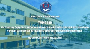 Thứ 7 tuần này (ngày 04/5/2024), Trung tâm Y tế huyện Thạch Hà vẫn triển khai khám, chữa bệnh Bảo hiểm y tế bình thường.Vậy Trung tâm thông báo cho người dân trên địa bàn và các vùng lân cận được biết để đến khám và điều trị.