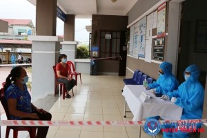 Cán bộ y tế tổ chức cho người dân sống trong khu vực có ca tái dương tính với Covid-19 tại xã Tượng Sơn khai báo y tế.