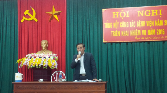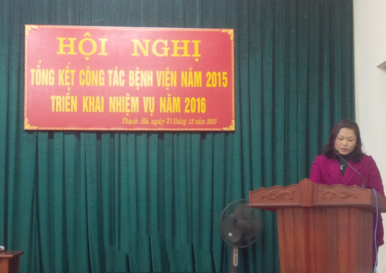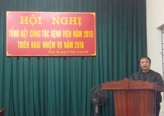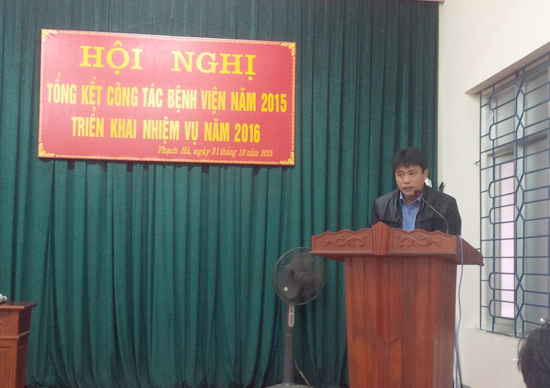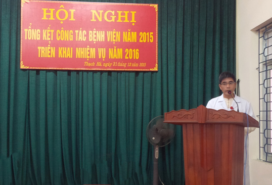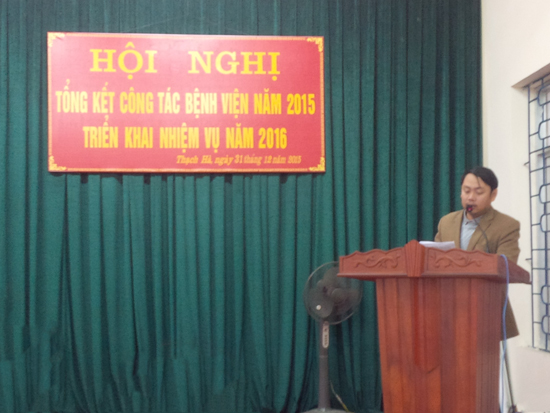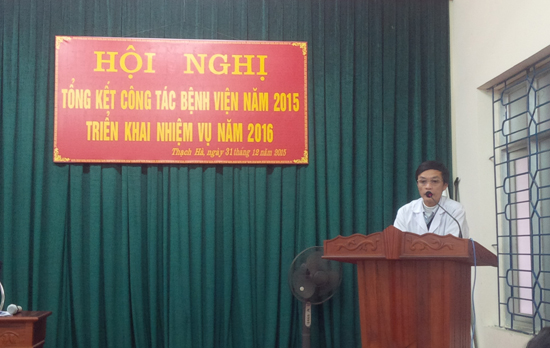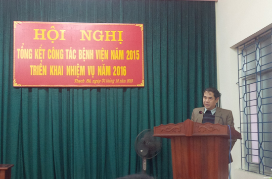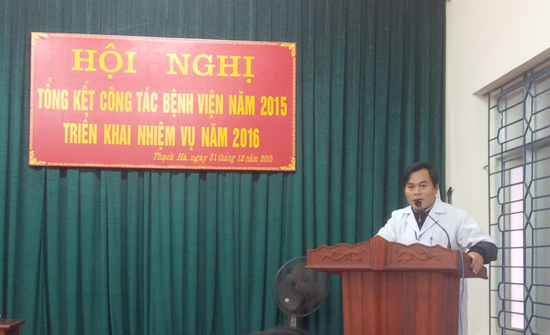 BS Phan Công Tý trình bày báo cáo tổng kết. Báo cáo tổng kết tại Hội nghị do Bs. Phan Công Tý - Trưởng phòng kế hoạch tổng hợp trình bày đã nêu rõ: năm 2015, tập thể cán bộ Bệnh viện Đa khoa huyện Thạch Hà đã đoàn kết thống nhất, hoàn thành xuất sắc nhiệm vụ chính trị, chỉ tiêu kế hoạch nhà nước giao. Công tác lãnh đạo, chỉ đạo và công tác chính trị tư tưởng được quan tâm đẩy mạnh, nhất là tinh thần, thái độ phục vụ người bệnh, xây dựng môi trường đoàn kết tôn trọng lẫn nhau trong cán bộ lãnh đạo, cán bộ viên chức bệnh viện. Không ngừng nâng cao chất lượng chuyên môn và tinh thần thái độ phục vụ, tạo uy tín cho bệnh viện phấn đấu thực hiện hoàn thành tốt các chỉ tiêu kế hoạch đề ra trong năm 2015.