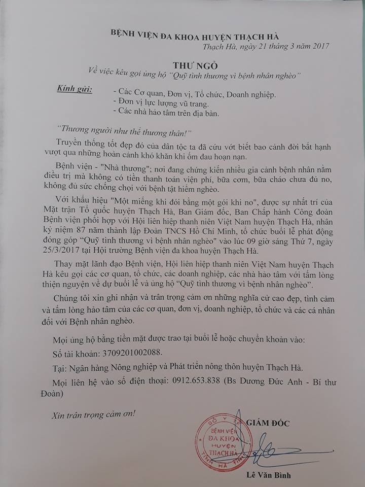 Thư ngõ về việc kêu gọi xây dựng “Quỹ tình thương vì bệnh nhân nghèo”