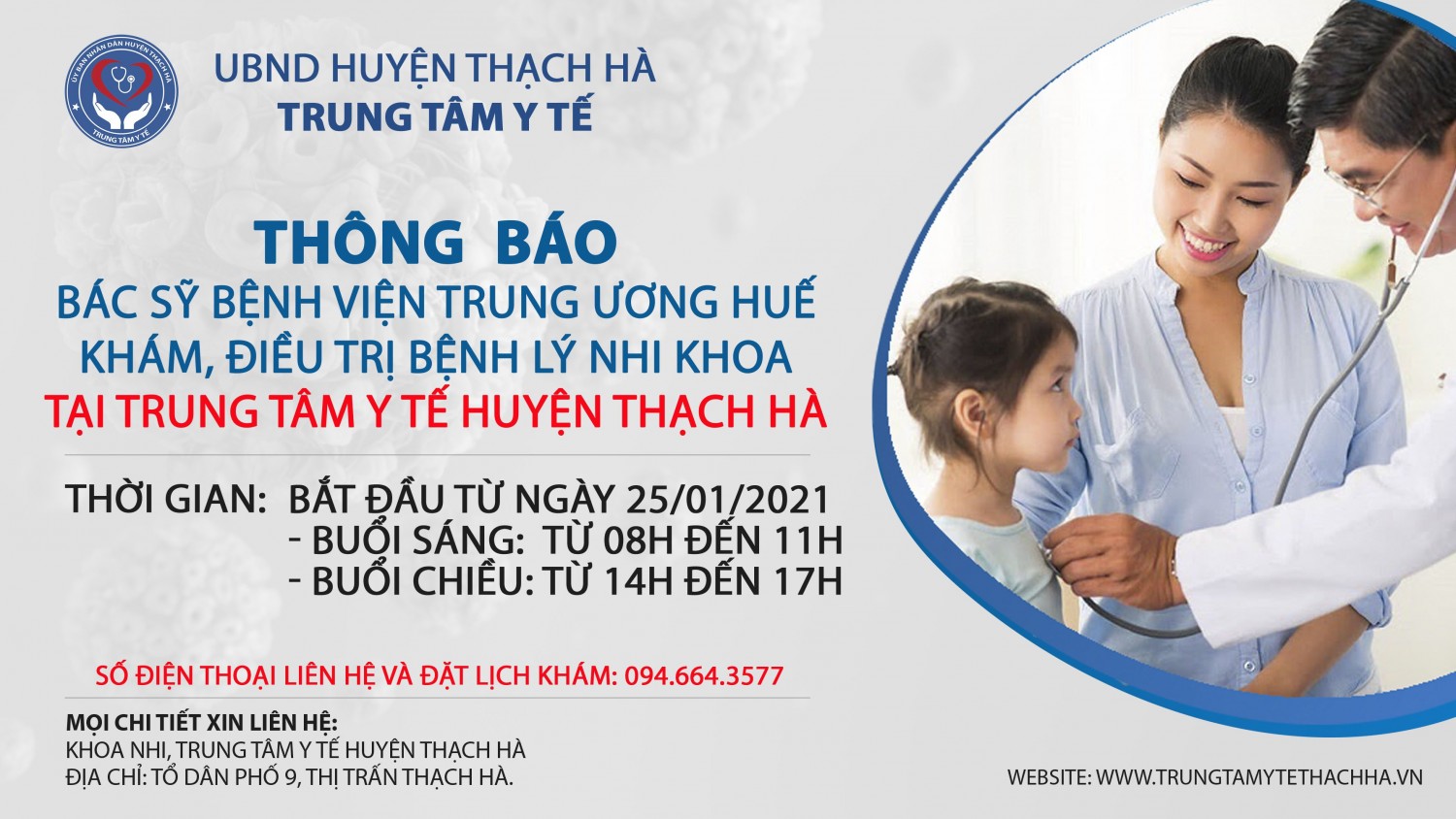 Thông báo về việc Bác sỹ Bệnh viện Trung ương Huế về khám và điều trị bệnh lý nhi khoa tại Trung tâm Y tế huyện Thạch Hà