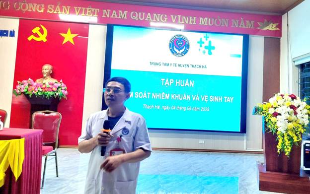 Chiều ngày 04/6/2025, Trung tâm Y tế huyện Thạch Hà đã tổ chức buổi tập huấn chuyên đề “Kiểm soát nhiễm khuẩn và Vệ sinh tay” cho toàn thể cán bộ, nhân viên y tế trong đơn vị. Hoạt động này được triển khai theo Kế hoạch số 509/KH-TTYT ngày 22/5/2025, nhằm nâng cao chất lượng chăm sóc, điều trị và bảo đảm an toàn cho người bệnh. Buổi tập huấn có sự tham gia của bác sĩ Võ Ánh Quốc – Phó Giám đốc Trung tâm Y tế huyện Thạch Hà, đồng thời là giảng viên trực tiếp trình bày các nội dung chuyên đề. Cùng tham dự còn có trưởng, phó các khoa/phòng và toàn thể cán bộ, nhân viên y tế đang công tác tại đơn vị.
