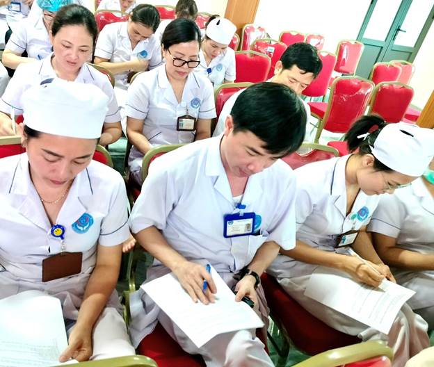 Cán bộ y tế thực hiện bài kiểm tra trước và sau tập huấn