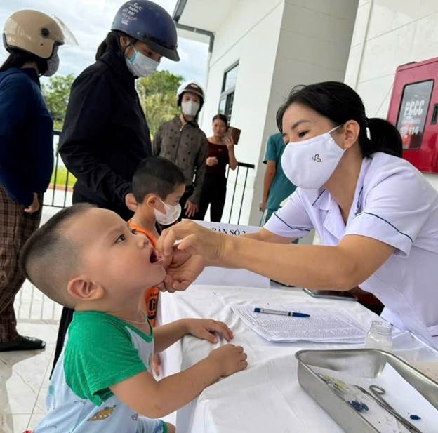 Cán bộ y tế xã Đông Kinh đang cho trẻ uống Vitamin A